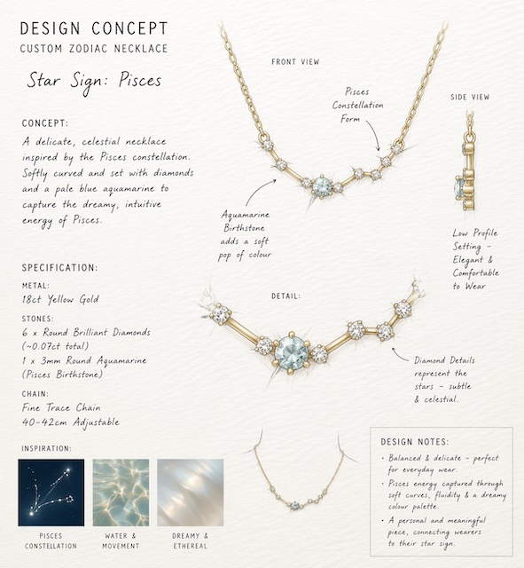 Similar to birthstones, another way to personalise jewellery is to look at your star sign. Each star sign has a constellation and a corresponding symbol, and often an object that represents it. Any of these could be incorporated in a subtle or more overt way when creating custom jewellery.
