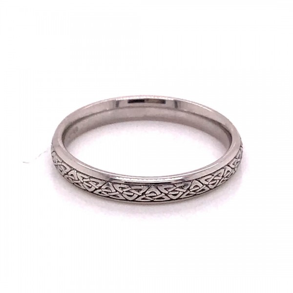 An 18ct white gold 3mm wide court shaped Celtic Knot design wedding band.