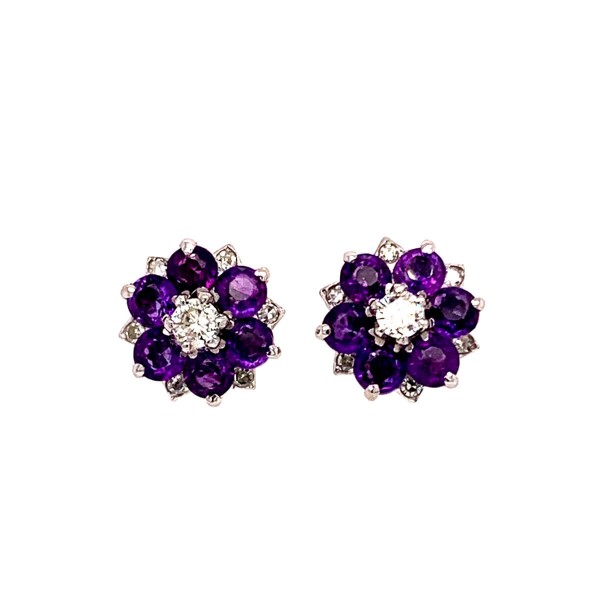 Round Amethyst & Round Brilliant Cut Diamond Cluster Stud Earrings