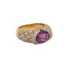 A bold statement occasion ring set with a purple chequer board cut oval amethyst with a pave set diamond dome all set in 18ct yellow gold.
