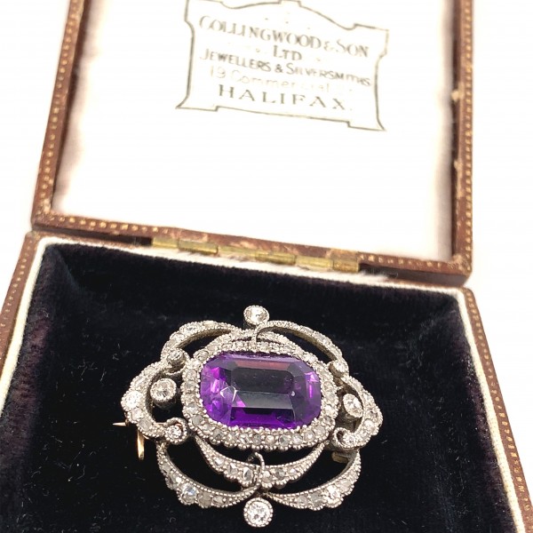 An Edwardian brooch set with a 5.50ct cushion cut amethyst with platinum surround set with old mine cut diamonds.