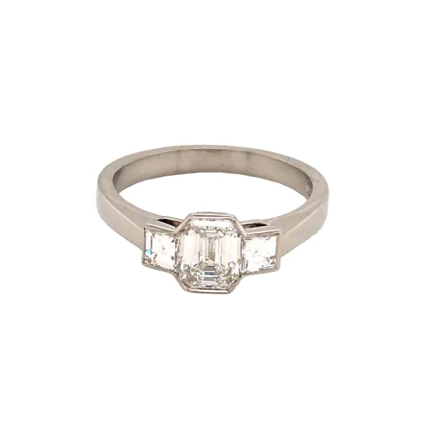 A certificated colour G and clarity VVS2 1.20ct emerald cut diamond with asscher cut diamonds to either side all set in a platinum rubover setting.