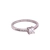 A 0.45ct princess cut diamond with small round diamond set shoulders all set in platinum.