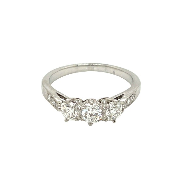 A 0.80ct round brilliant cut diamond trilogy ring claw set in platinum with diamond set shoulders.