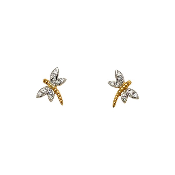 Round brilliant cut diamond earrings in 18ct yellow gold in the shape of dragonflies.
