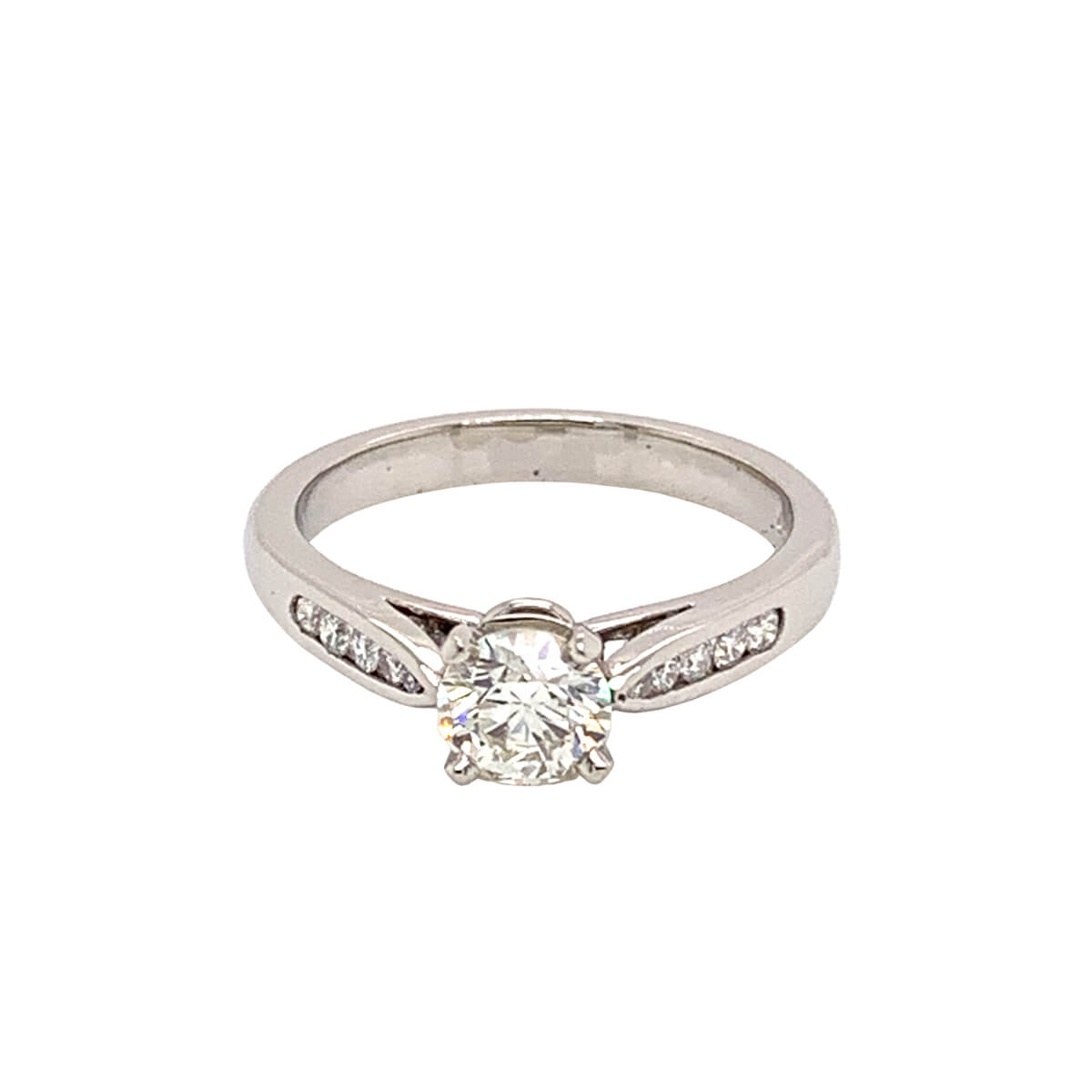 A round brilliant cut diamond solitaire ring claw set with diamond channel set shoulders all in platinum.