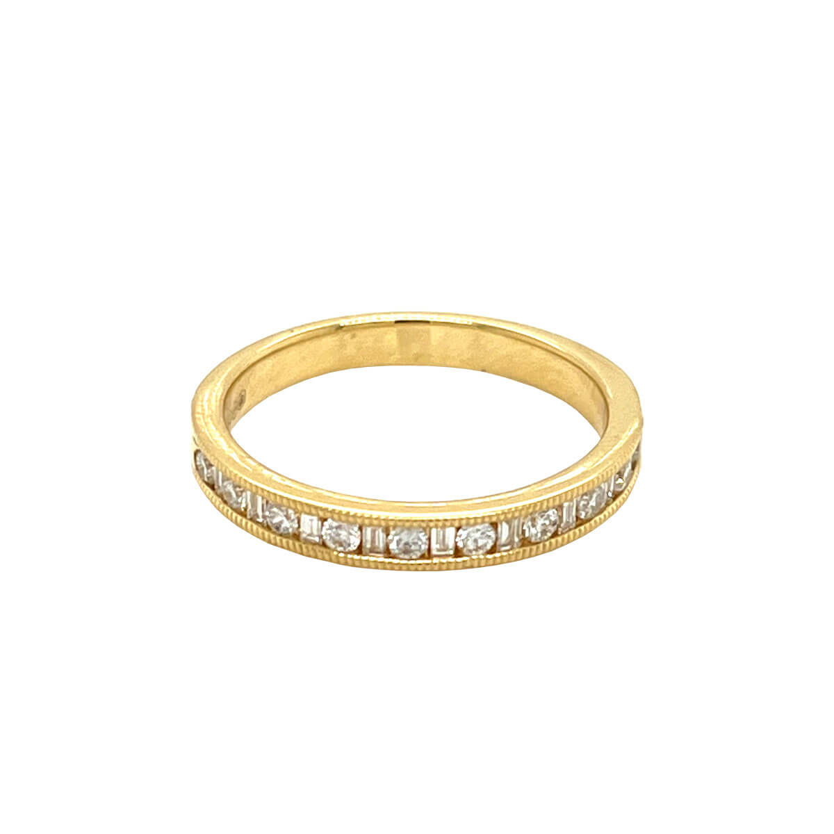 A 0.25ct round brilliant and baguette cut diamond half eternity ring channel set in 18ct yellow gold.