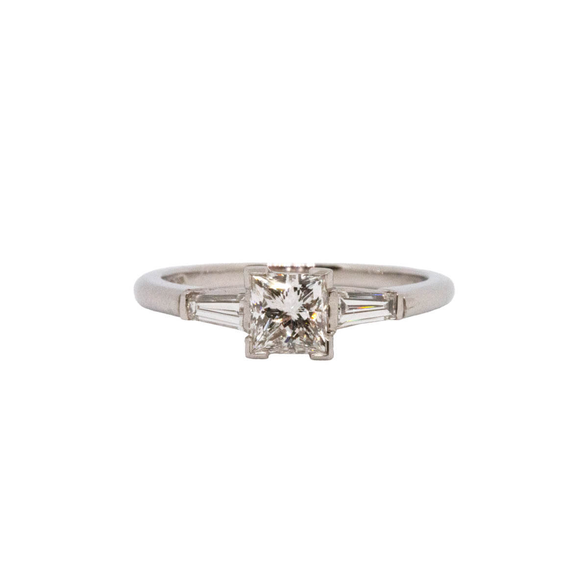A central certificated colour G and clarity VS1 princess cut diamond with baguette cut diamonds to either side all set in platinum.