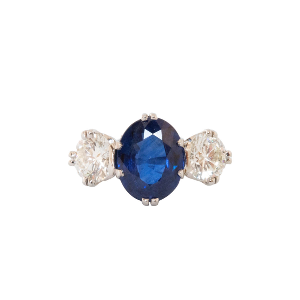 A stunning central oval sapphire with round brilliant cut diamonds to either side claw set in platinum.