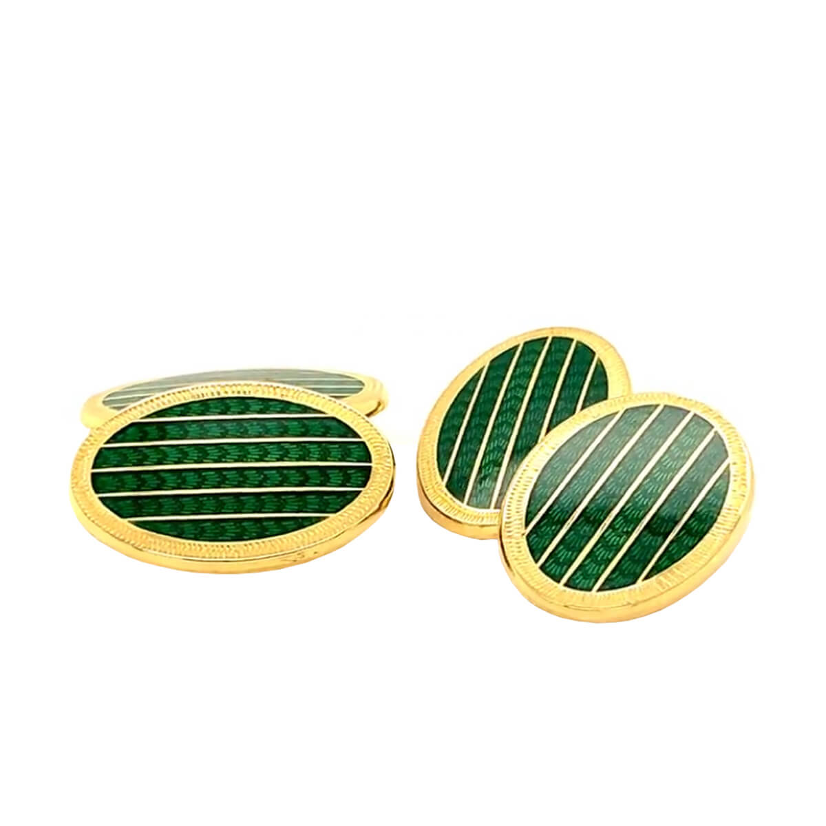 A pair of oval 18ct yellow gold green striped cufflinks with double chain link.