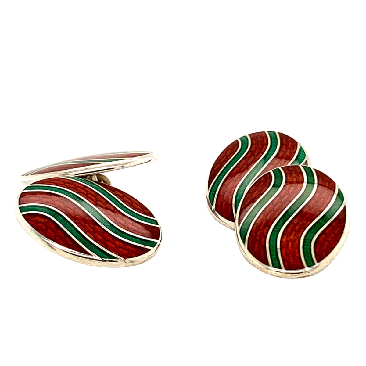 Sterling silver oval chain fitting cufflinks with red and green wave enamel.