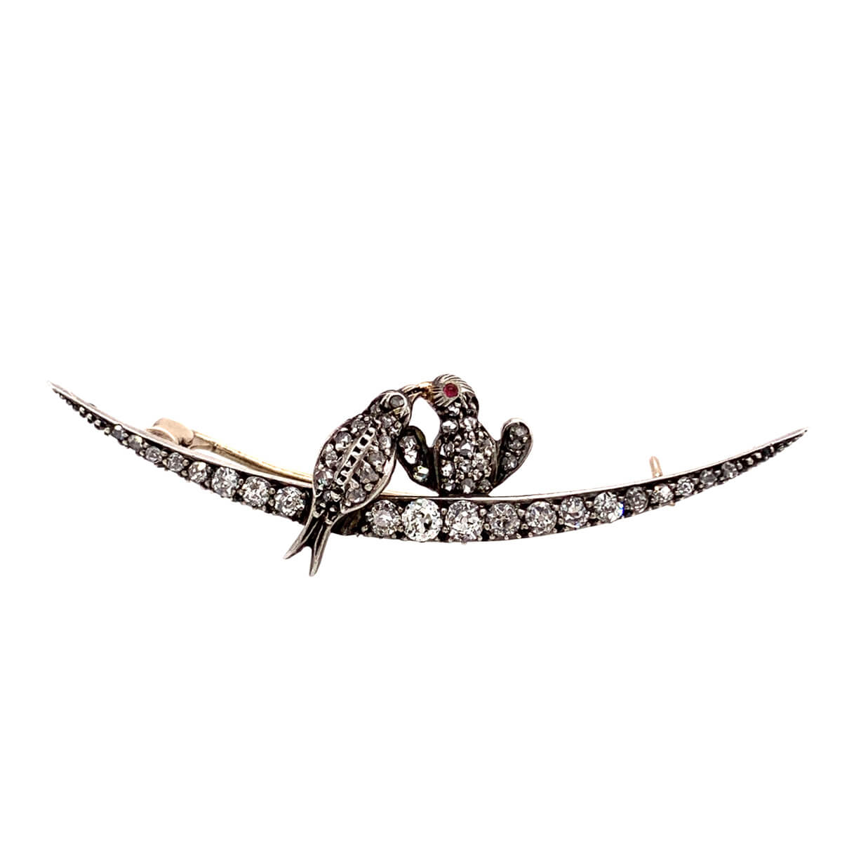 A silver and gold crescent shaped Victorian diamond set brooch set with birds.