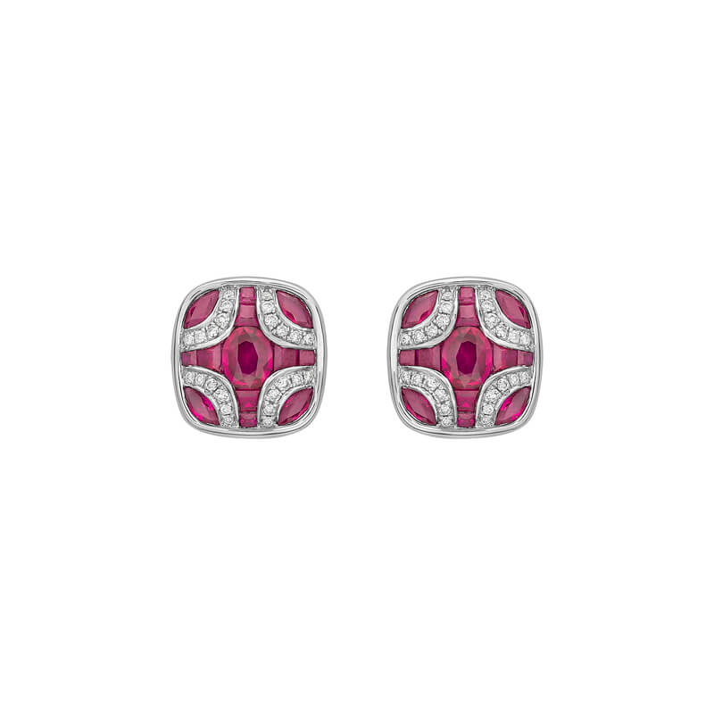 A pair of ruby and diamond cluster stud earrings in an Art Deco style set in 18ct white gold.