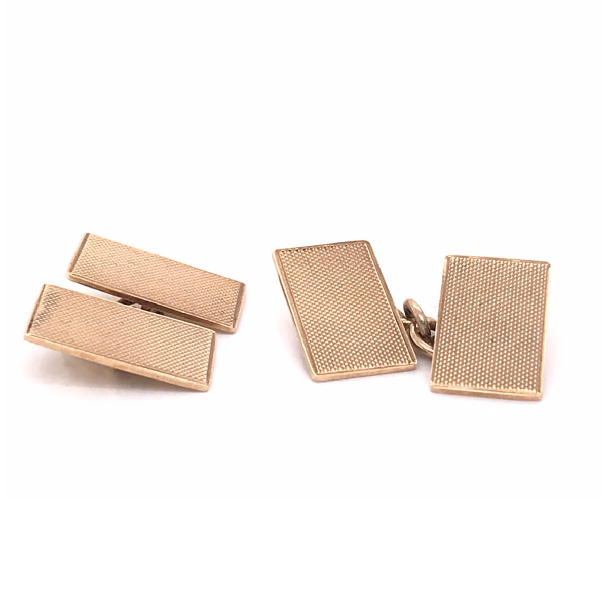 A pair of 9ct yellow gold rectangular cufflinks with chain fittings.