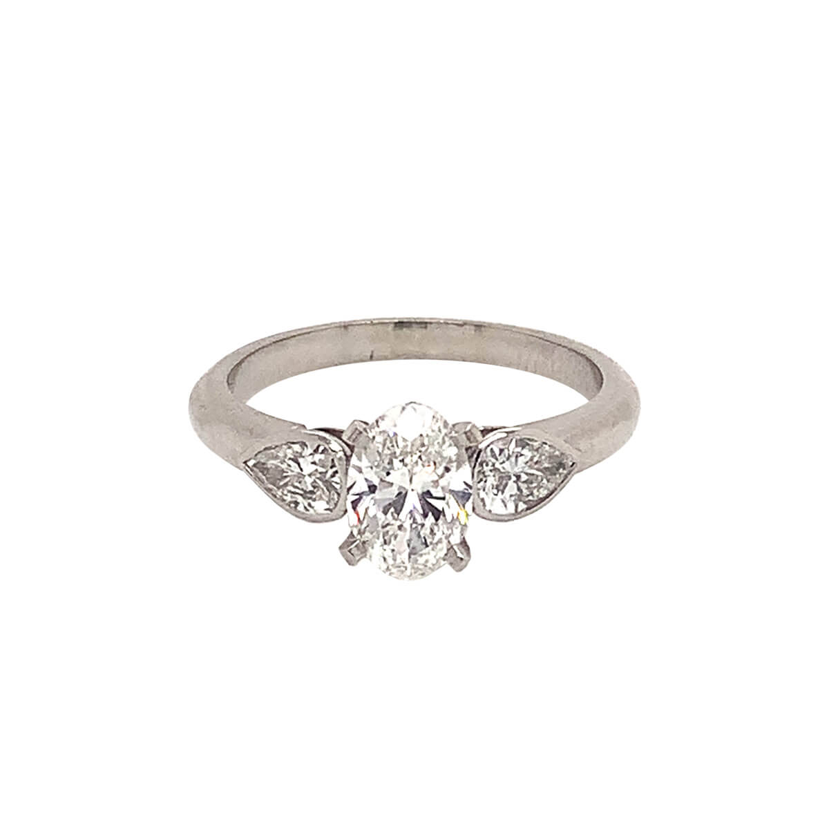 An oval and pear shaped diamond trilogy ring set in platinum.
