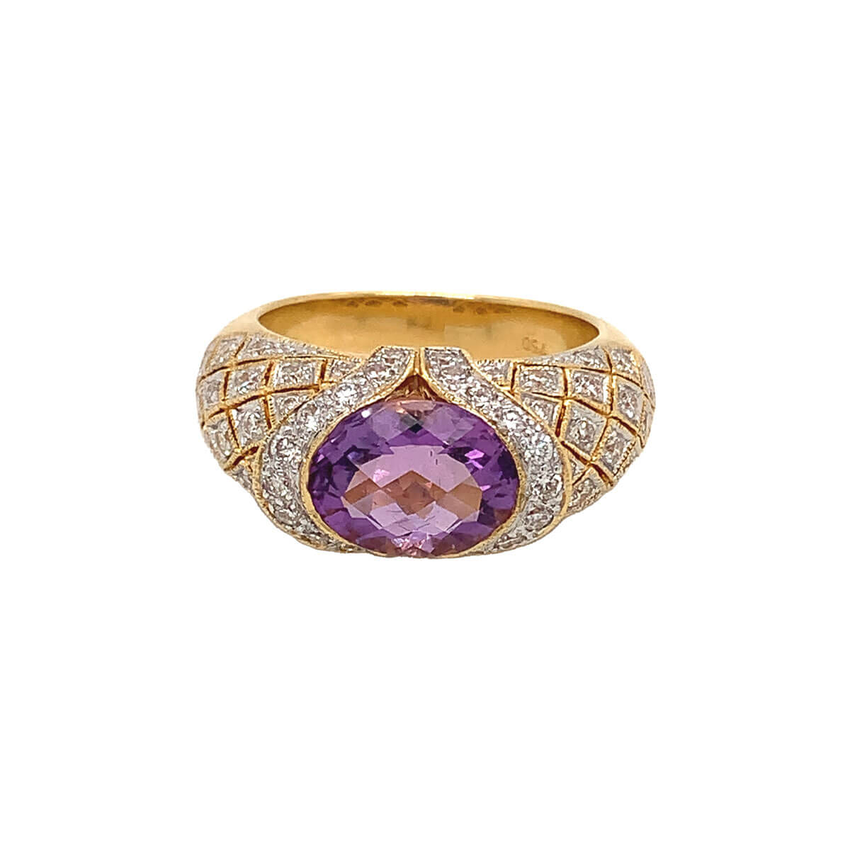 A bold statement occasion ring set with a purple chequer board cut oval amethyst with a pave set diamond dome all set in 18ct yellow gold.