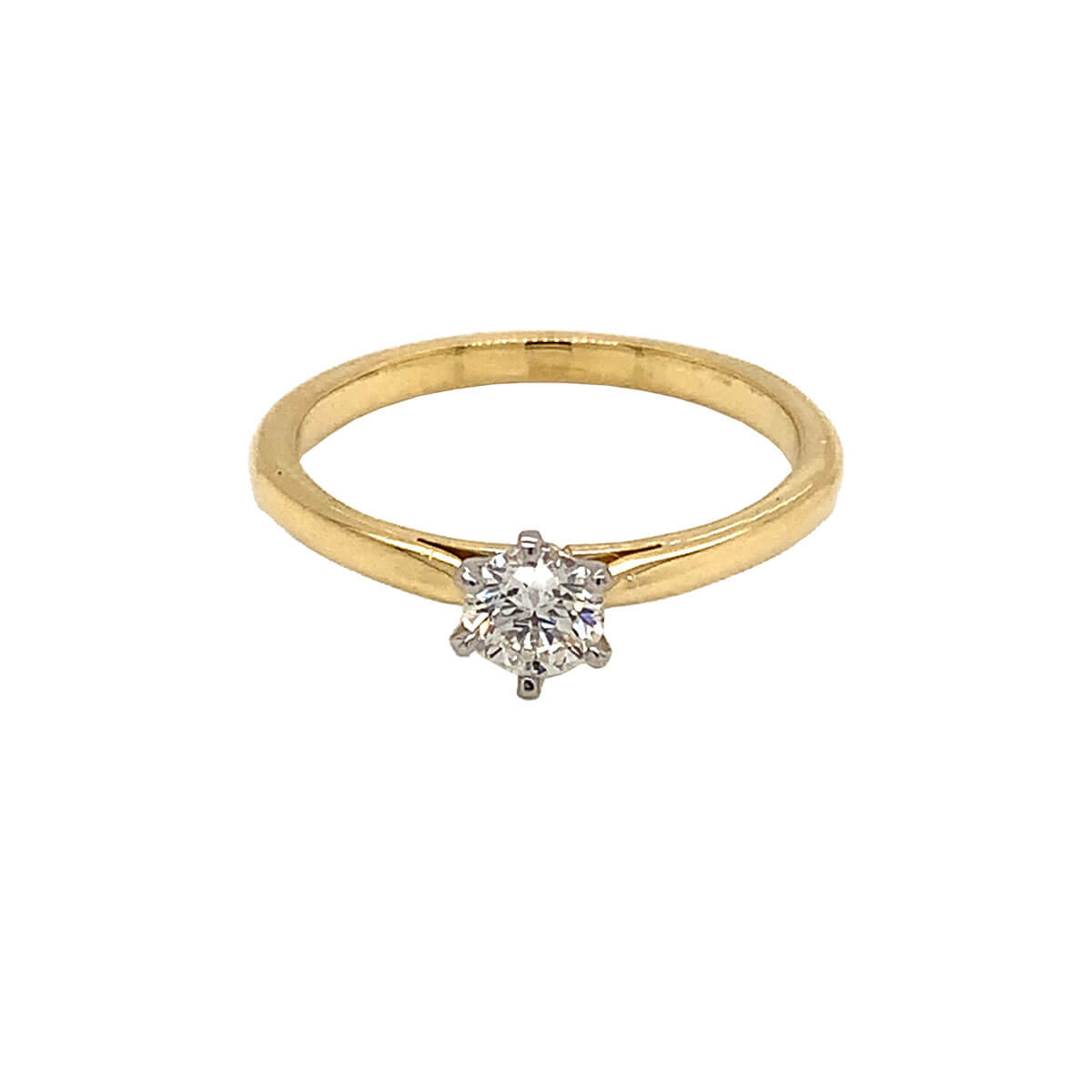 A round brilliant cut diamond six claw solitaire ring made in house in 18ct yellow gold with a platinum setting.