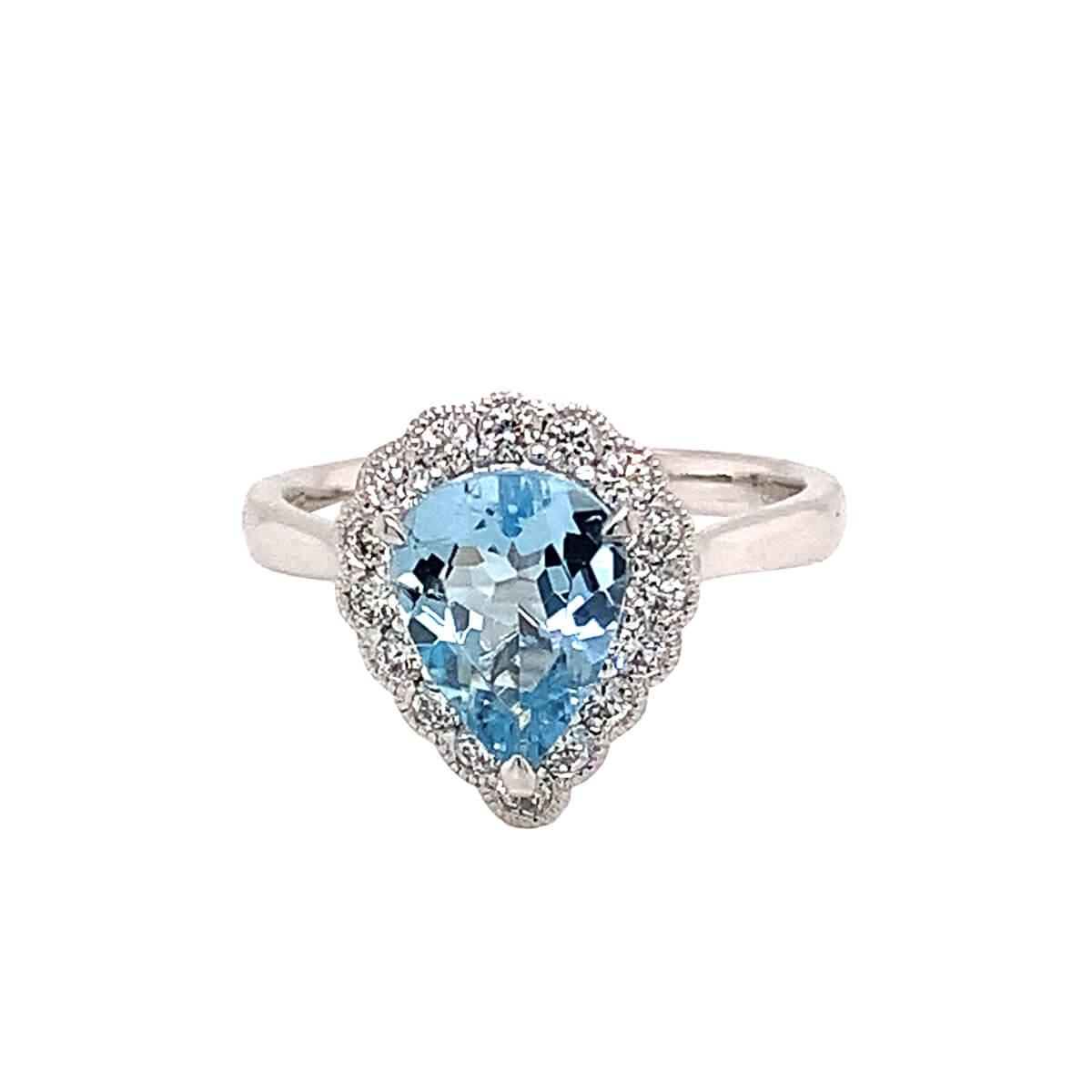 1.27ct Pear Shaped Aquamarine & Diamond Halo Cluster Ring