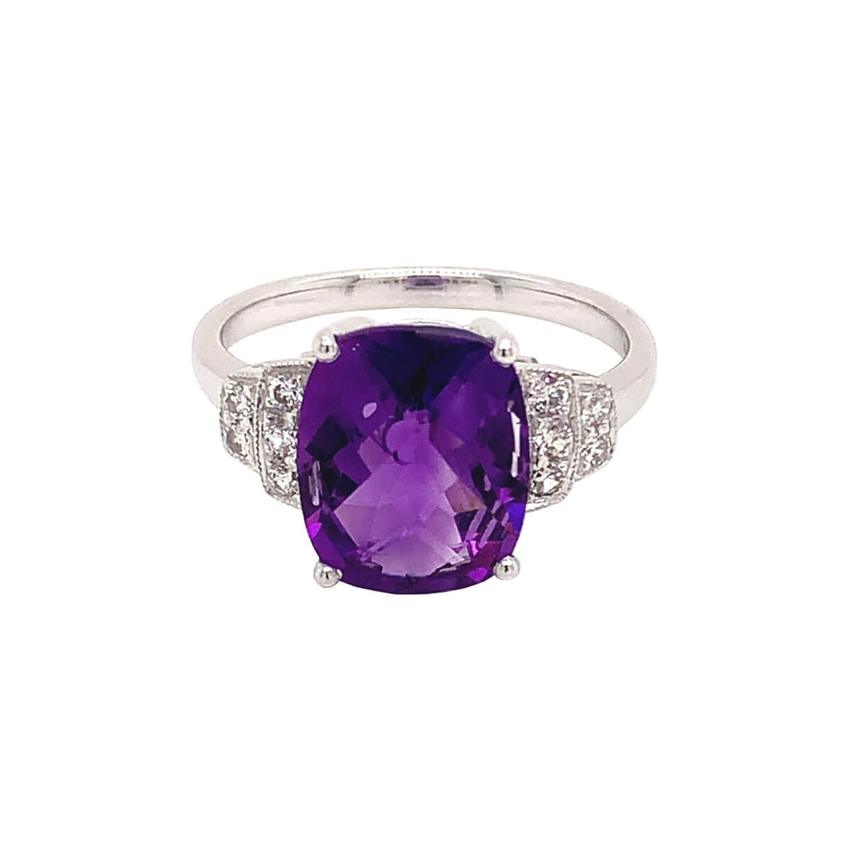 A cushion cut amethyst with chequer board facets four claw set surrounded by 10 small round brilliant cut diamonds with stepped shoulders all set in 18ct white gold.