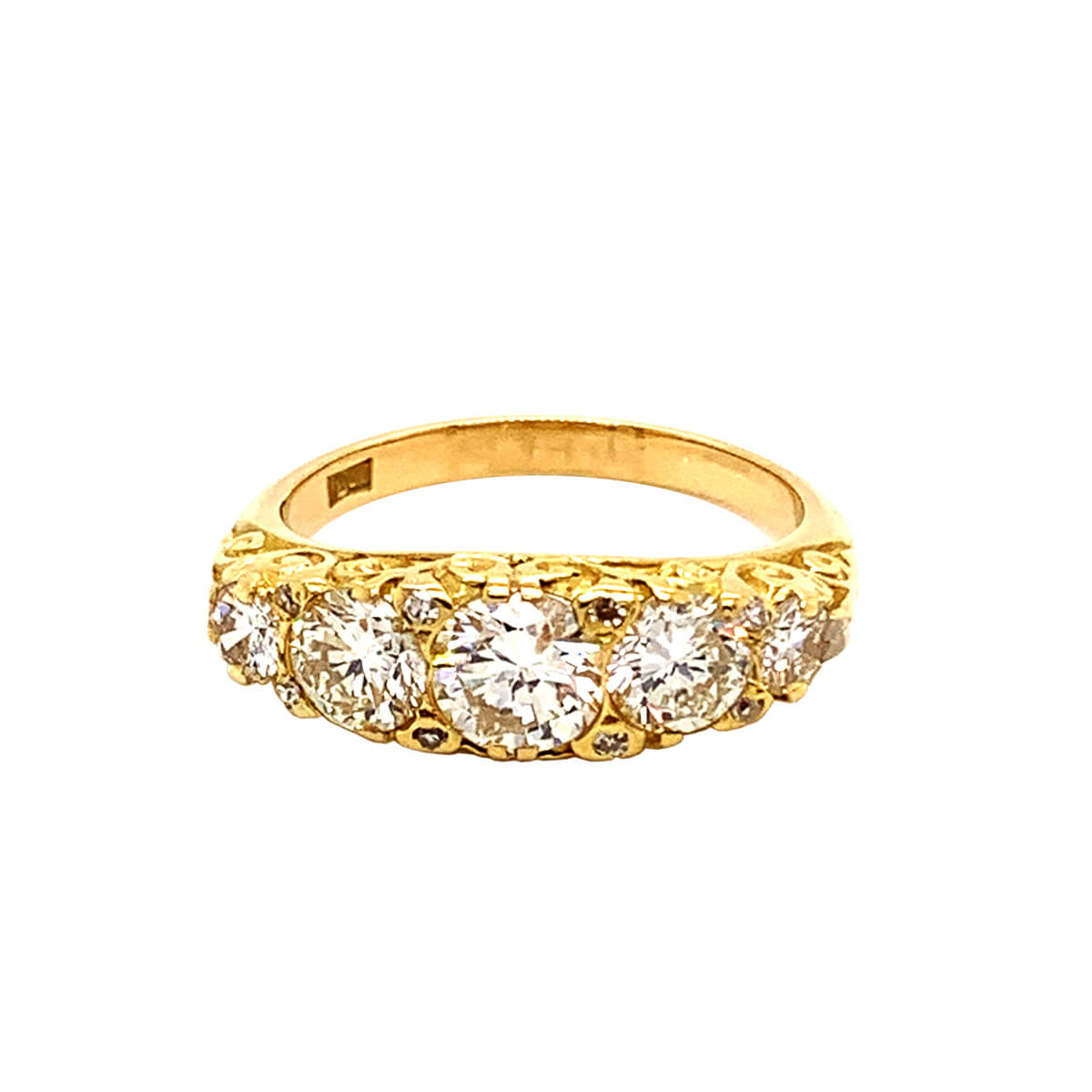 A Late Victorian carved half hoop ring set with five old cut diamonds and eight small keeper diamonds between the main stones set in 18ct yellow gold.