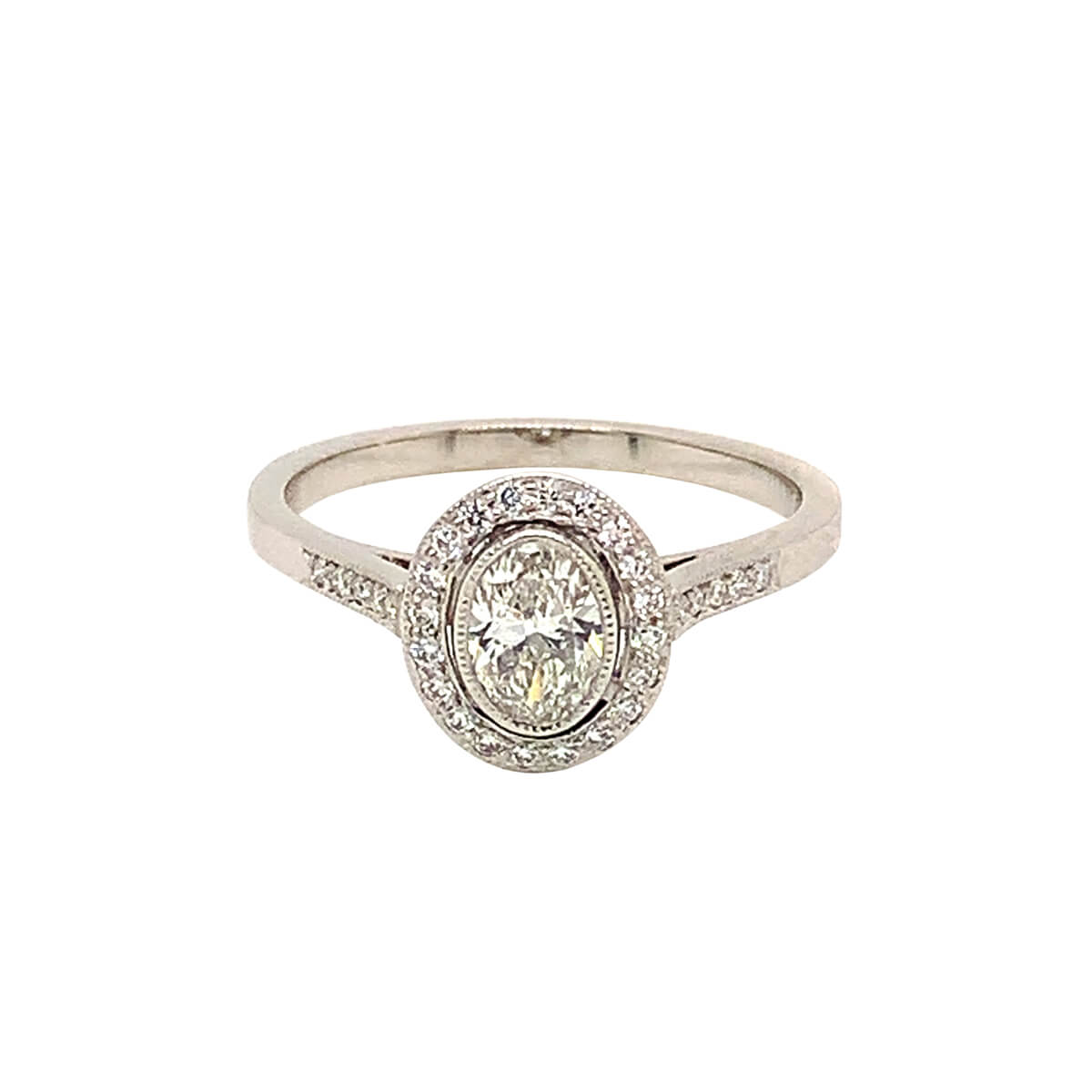 A certificated 0.50ct colour G and clarity VS2 oval shaped diamond with a round brilliant cut diamond halo surround all in platinum.