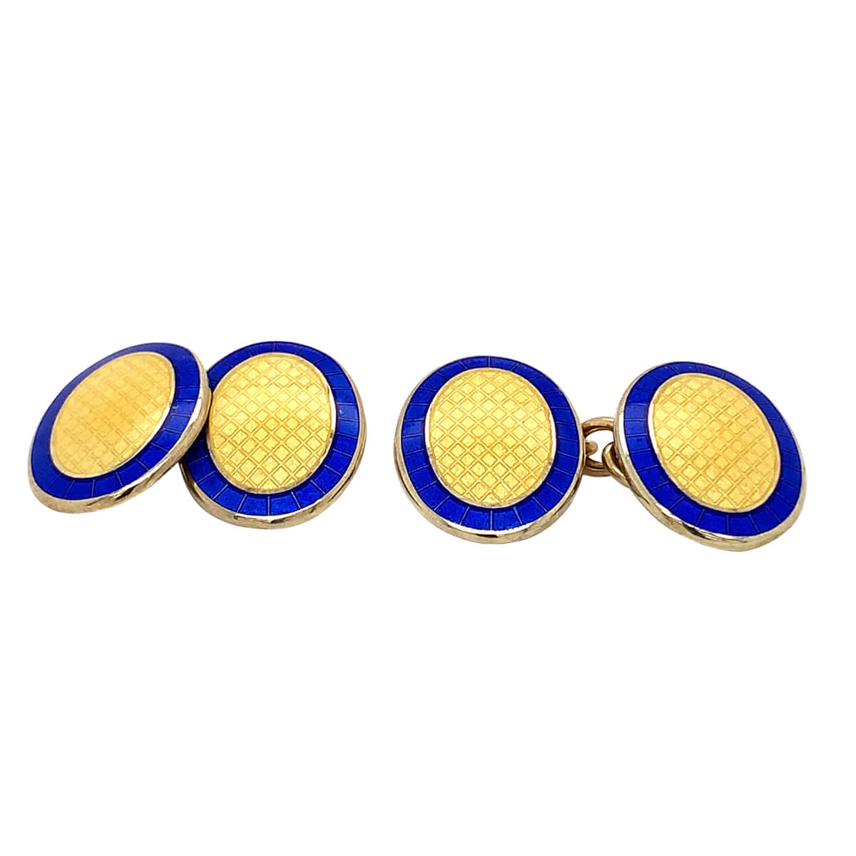 A pair of oval 9ct yellow gold engine turned yellow and blue cufflinks with double chain link.
